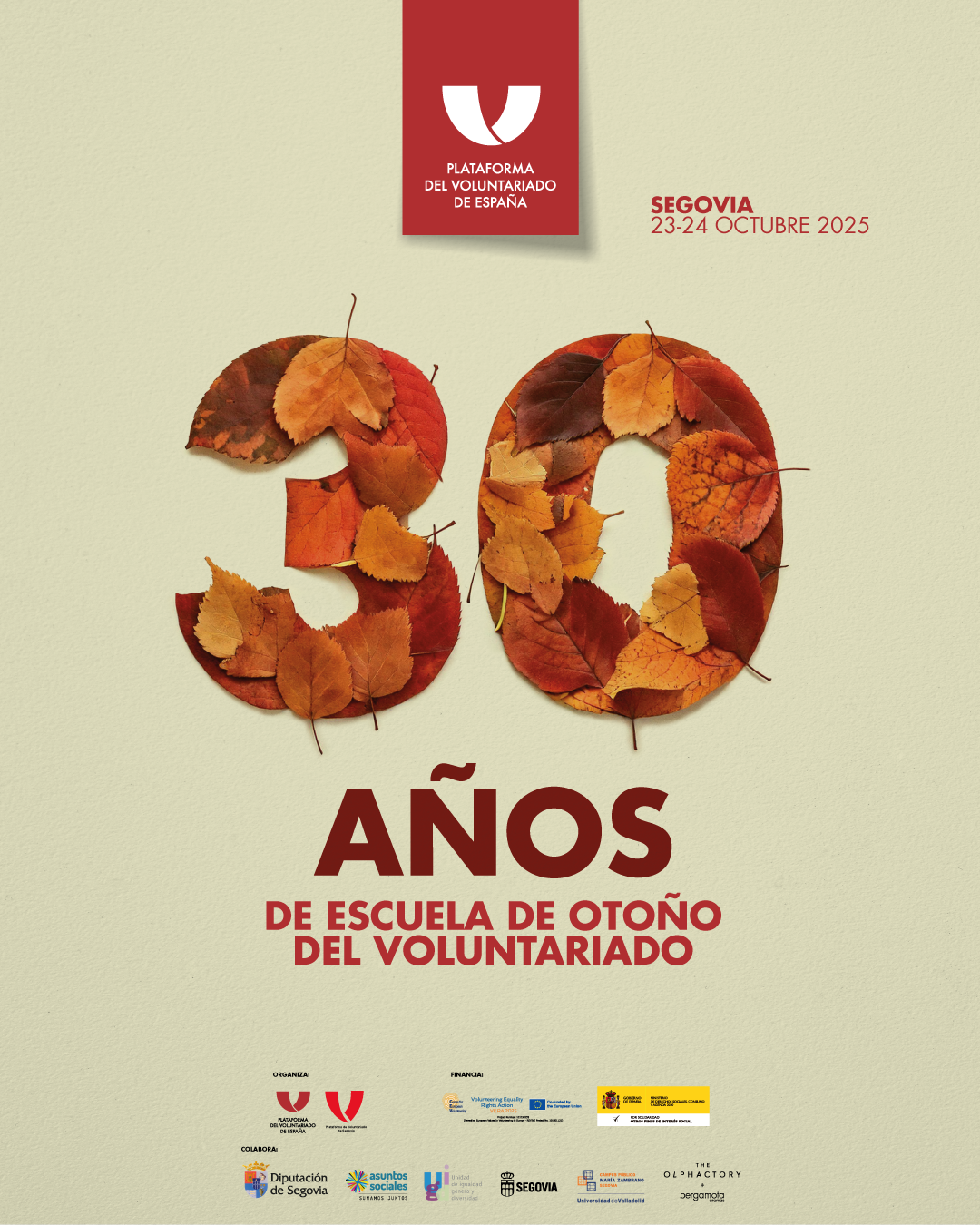 Este año, en los días 23 y 24 de octubre en colaboración con la Plataforma de Voluntariado de Segovia conmemoramos los 30 años de la Escuela de Otoño en el Campus María Zambrano Segovia (Universidad de Valladolid)
